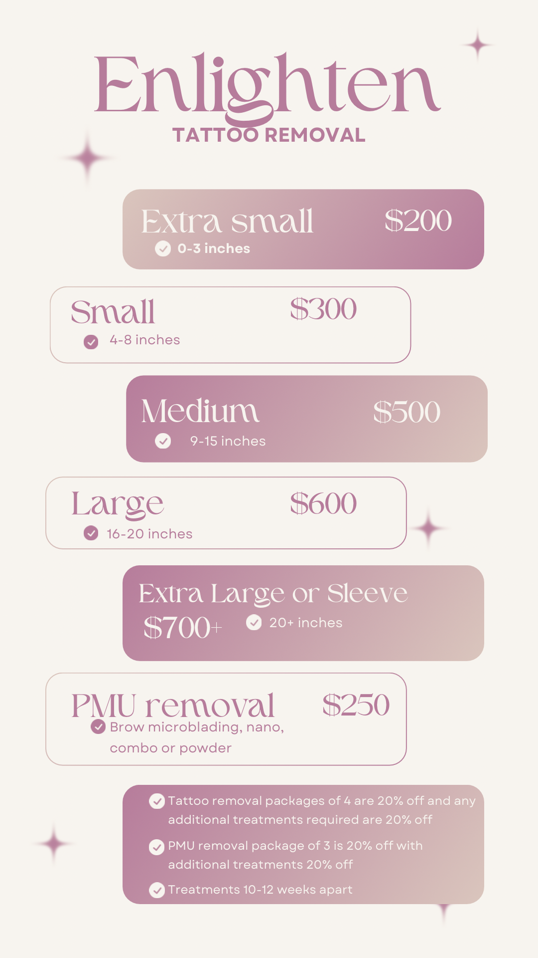 Enlighten features extremely short and high-power picosecond laser pulses which efficiently and quickly break down the ink particles in tattoos. A 'picosecond' is one-trillionth of a second, and is 1,000 times shorter than the 'nanosecond' pulses used in existing lasers for tattoo removal. Picosecond laser pulses have been shown to remove tattoos more completely and in fewer treatment sessions than traditional laser used historically in the past.